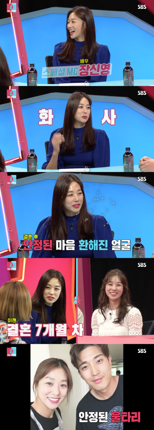 이날 장신영은 더욱 밝아진 얼굴로 등장해 모두의 시선을 한몸에 받았다. “얼굴이 확 폈다”는 김숙의 말에 장신영은 “지나다니면서 그런 소리 많이 듣는다. 결혼하고 나서 마음에 안정이 되면서 그게 얼굴에 효과가 나오는 것 같다”고 답했다.