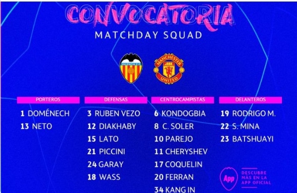발렌시아는 11일(한국시간) 홈페이지를 통해 맨체스터 유나이티드와 2018-2019 유럽축구연맹(UEFA) 챔피언스리그 H조 6차전 홈 경기에 나설 18명 출전 명단을 발표했다.