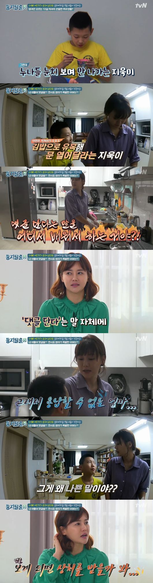 누나 친구가 안방에 들어오지 못하고 망설이자 송지욱은 "댓글 달아줄게"라고 소리쳤다. 그런데 이 말을 엄마 박연수가 오해하고 말았다. 주방에서 요리하던 그는 별안간 송지욱을 소환해 "댓글 단다는 말을 어디서 배워서 하는 거야?"라고 화를 냈다.