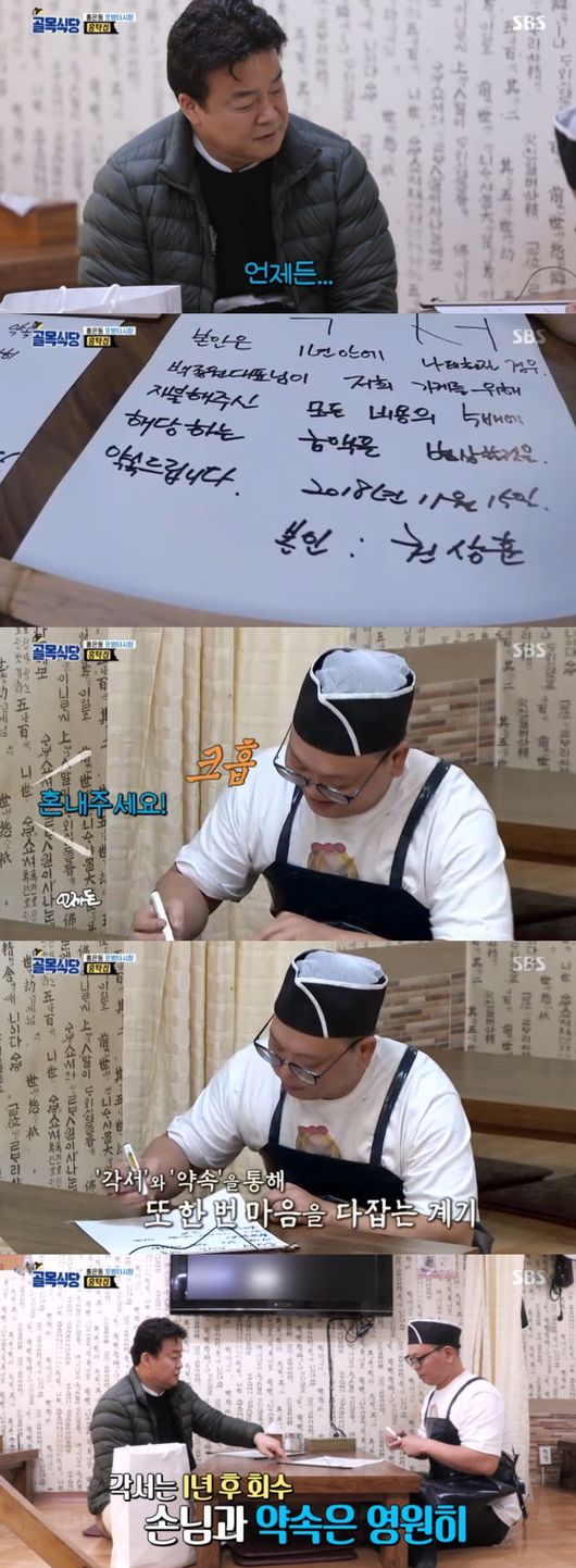 먼저 홍탁집 아들이 그려졌다. 아들은 바쁜 준비로 아침을 맞이했다. 홍탁집 아들은 복장까지 깔끔하게 갖추고 있었다. 백종원도 의문의 박스를 들고 나타났다. 손에 들린 박스의 정체는 냄비였다. 뚝배기가 시작이 오래걸려 양은냄비로 바꾸자는 의견이었다. 그리곤 백종원은 약속했던 각서를 쓰자고 했다. 백종원은 '1년 안에 나태해질 경우, 모든 비용의 다섯배에 해당하는 금액을 변상하겠다' 고 적으라고 했다. MC들은 "매정하다고 할수도 있으나 골목식당 하면서 금전적, 시간적으로도 역대급 투자했다"면서 "각서와 약속을 통해 다시 한번 마음을 잡을 것"이라 했다. 이어 백종원은 '손님께 드리는 약속, 제가 나태해져 보이면 언제든 혼내주세요'도 적으라고 했다. 각서는 1년 후 회수, 손님과 약속은 영원히 지켜야한다고. 전국민이 증인이 된 가운데, 홍탁집 아들은 이를 적어냈다.