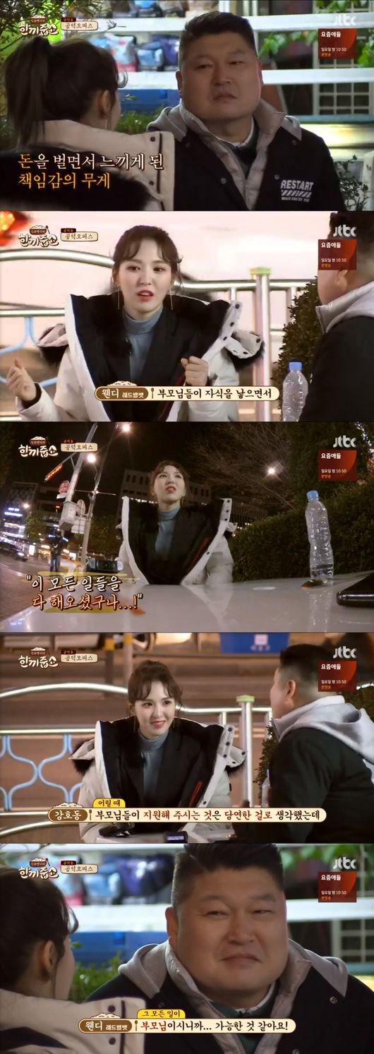 그러면서 돈을 버는 게 쉽지 않다고 털어놓았다. 웬디는 “돈을 벌어보니 힘들다. 돈 관리부터 책임져야 하는 일들이 하나 하나 생기니까 부모님이 이제까지 이렇게 해온 거구나 느끼면서 돈 버는 게 더 힘들다는 걸 느꼈다”며 “부모님이니까 그게 가능한 것 같다”고 밝혔다.