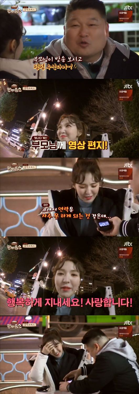 그러면서 강호동은 웬디에게 부모님께 영상편지를 써보라고 했고 웬디는 “부모님이 내 목소리만 들어도 운다. 내가 힘든 걸 티낼까봐 걱정돼서 자주 연락 못하는데 나 진짜 너무 잘 있고 건강하고 요새 들어서 더 행복하게 가수 생활하면서 지내고 있다. 열심히 돈 벌어서 모셔올 테니까 둘이 그동안 건강하게 알콩달콩 행복하게 지내세요”라고 기특한 효녀의 마음이 눈길을 끌었다.