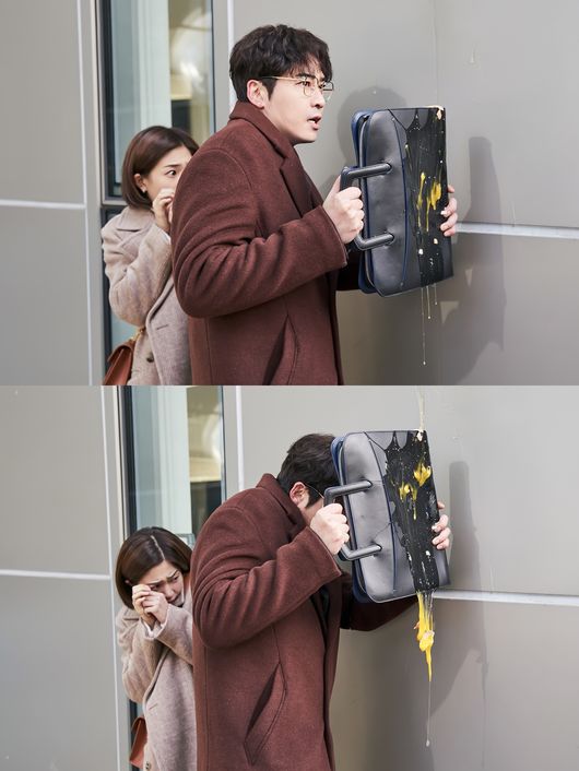 하지만 백진상이 이루다(백진희 분)와 함께 회사 한복판에서 날계란 테러를 당하고 있는 적나라한 모습이 공개돼 시청자들의 시선을 강탈하고 있다. 국민 영웅으로 떠오르던 백진상과 그를 돕던 이루다가 하루아침에 속수무책 봉변을 당해 두 사람에게 아찔한 사건이 발생했음을 예상케 한다.