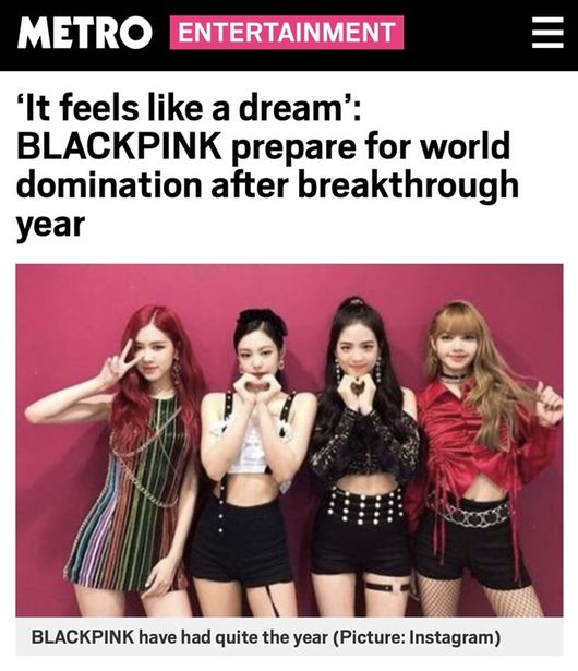 지난 12일(현지 시각) 영국 메트로는 ‘블랙핑크, 성공적인 한 해를 보내고 세계제패를 위한 준비를 마치다’라는 제목의 기사를 게재하며 올해 블랙핑크가 이룬 성과와 미래 잠재력에 대한 찬사를 아끼지 않았다.