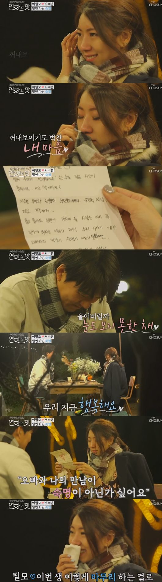 수연이 필모에게 손편지를 전했다. '우리의 만남이 진짜 필연일지 아닐지 모르지만 앞으로가 더 기대돼요. 방송으로 만났지만 카메라 밖에서도 오빠랑 즐겁게 만나고 싶습니다 너무 고맙습니다'