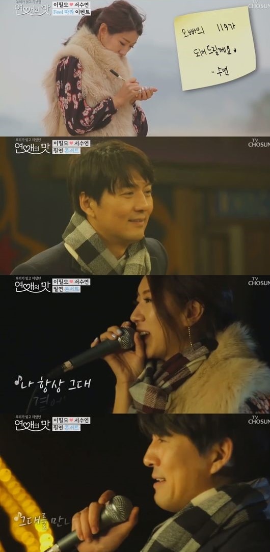 서수연은 이문세의 '소녀'를 불렀고, 이필모는 답가를 하기 위해 자리에서 일어났다. 서수연은 이필모의 노래에 감동받아 눈물을 뚝뚝 흘렸고, 이를 본 이필모도 감정이 북받쳐 눈가가 촉촉해졌다.