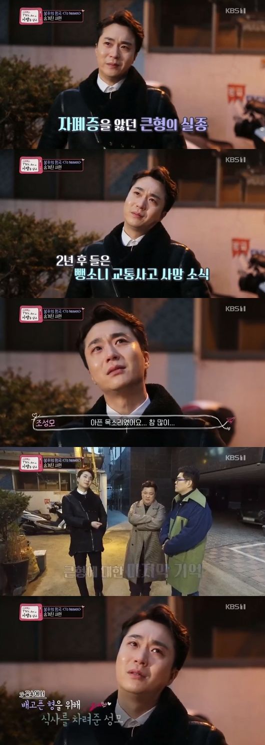그러면서 조성모는 과거 자신을 예뻐한 큰형에 대해 언급했다. 조성모는 "큰형은 내 마음의 근간이다. 자폐증을 앓던 형은 실종 이후 뺑소니 사고로 사망했다"고 털어놓으며 울먹였다.