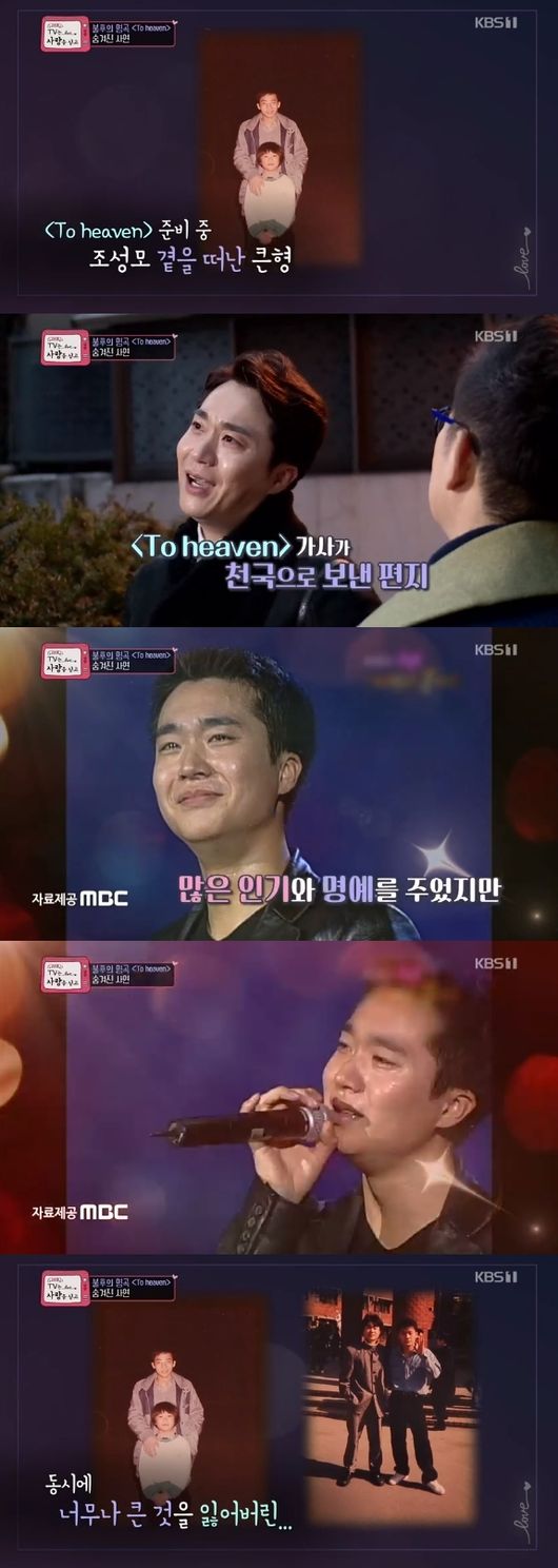 이어 조성모는 "형이 어느날 천국으로 가기 전 내 꿈에 인사를 하러왔다. 배고프다고 하는 형을 위해 밥을 차려주니 잘 먹었다고 말하며 나갔다. 그 때 실종된 큰형의 죽음을 예감했고, 이후 '투헤븐'을 불렀다"고 털어놨다.