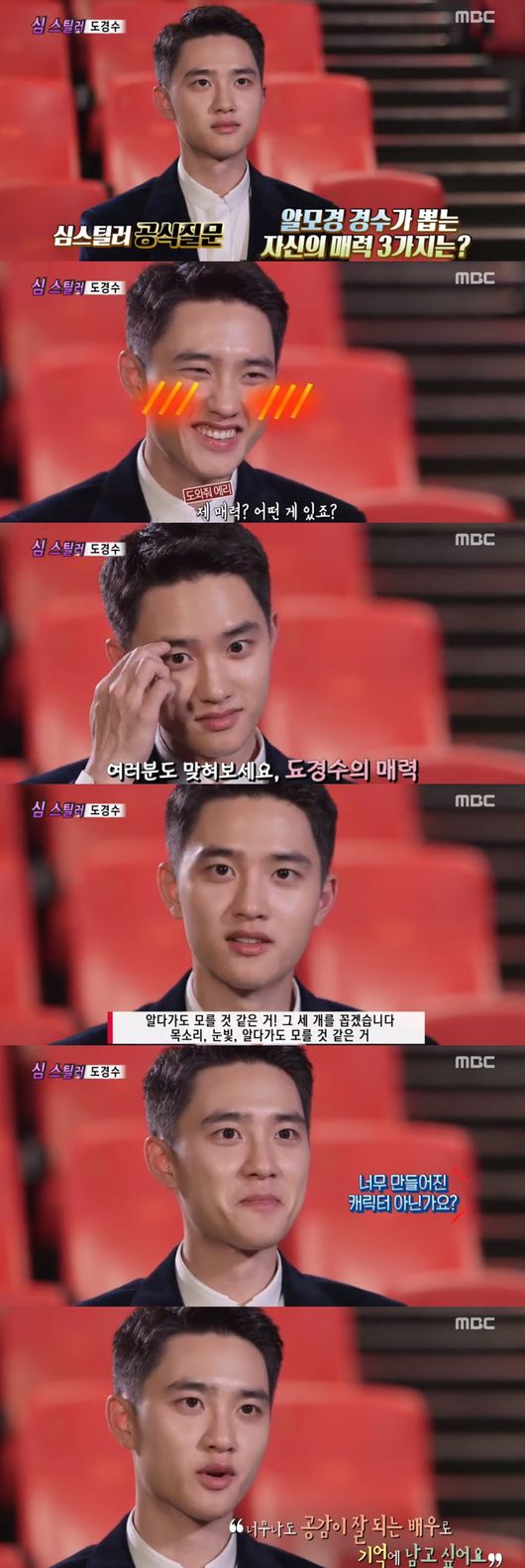 팬들은 도경수에 관해 '알다가도 모를 경수'라며 '알모경'이라고 부르고 있다. 도경수는 자신의 매력 3가지를 말하라는 질문에 목소리, 눈빛, 알다가도 모를 매력을 간신히 꼽았다.