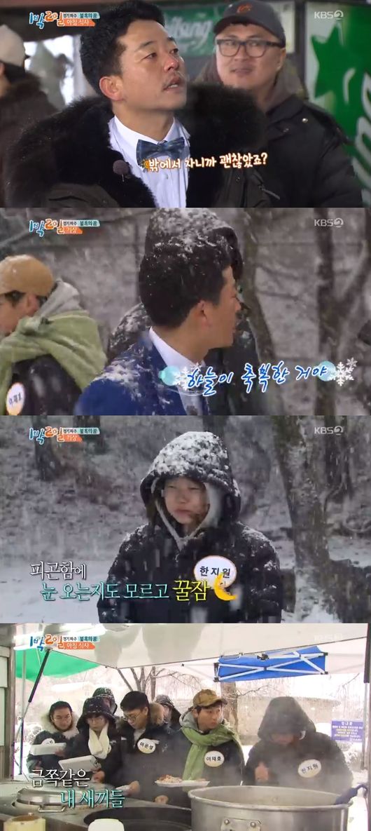 밤새 내린 눈으로 냉장고 박스는 하얗게 변했다. 김준호는 눈을 맞으면서 기상 송으로 '마이 웨이'를 불렀다. 따듯한 아침 식사를 기다리면서 김준호와 연습생들은 눈싸움을 했다. 차태현은 눈사람을 만들었다. 김준호는 후배들을 위해서 직접 달걀 프라이를 만들어주고 마지막에 밥을 먹었다. 눈을 바라보며 멤버들과 연습생은 식사를 마치고 돌아갔다.