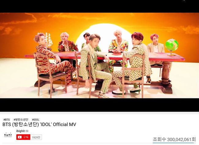 그룹 방탄소년단의 ‘IDOL’ 뮤직비디오가 조회수 3억뷰를 돌파했다.
