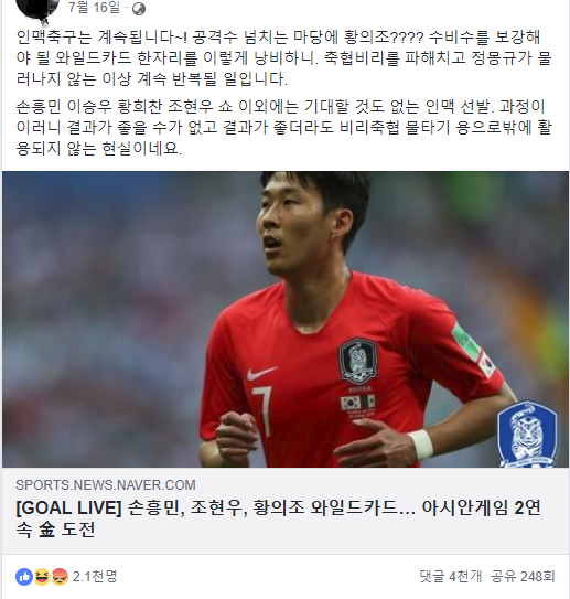 당시 유 모 의원은 "인맥 축구는 계속된다. 공격수가 넘치는 마당에 황의조? 수비수 대신 와일드카드를 낭비한 것은 축구협회의 비리때문이다. 과정이 이러니 결과가 좋을 수 없고, 결과가 좋다고 물타기에 불과한 것이 현실이다"고 주장했다.