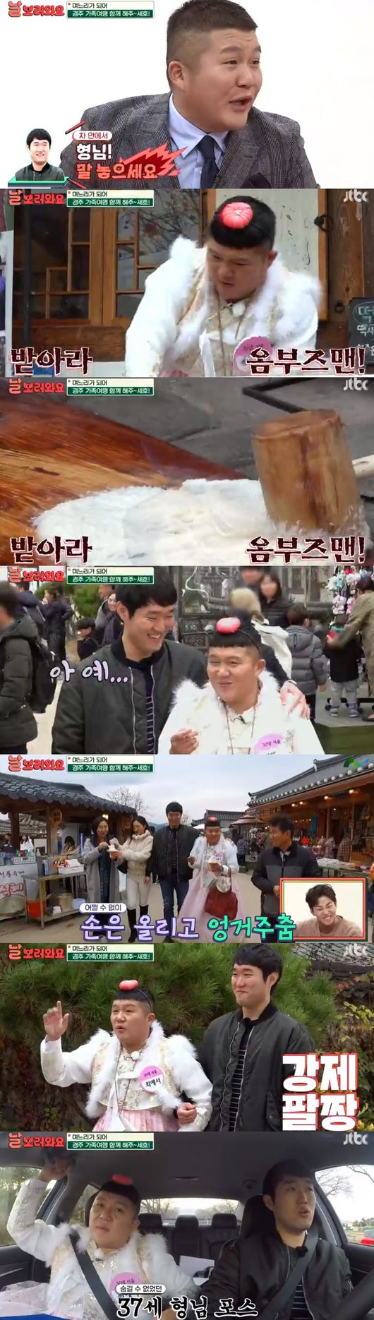 조세호는 시댁 식구들을 위해 경주의 핫플레이스를 소개해주며 일일 가이드를 자처했다. '힘 좋으면 공짜'라는 떡메치기 체험 이벤트에 도전해 괴력을 과시해 웃음을 자아냈다.