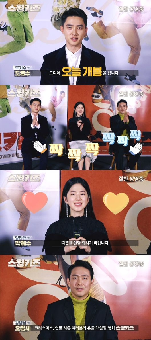 시사 이후 남녀노소 관객들의 폭발적인 입소문으로 올 크리스마스와 연말 극장가를 사로잡을 영화 '스윙키즈'의 도경수, 박혜수, 오정세가 개봉일을 맞이해 관객들에게 직접 전하는 인사 영상을 공개했다. [제공/배급 NEW | 제작 ㈜안나푸르나필름 | 각본/감독 강형철 | 출연 도경수, 박혜수, 자레드 그라임스, 오정세, 김민호]