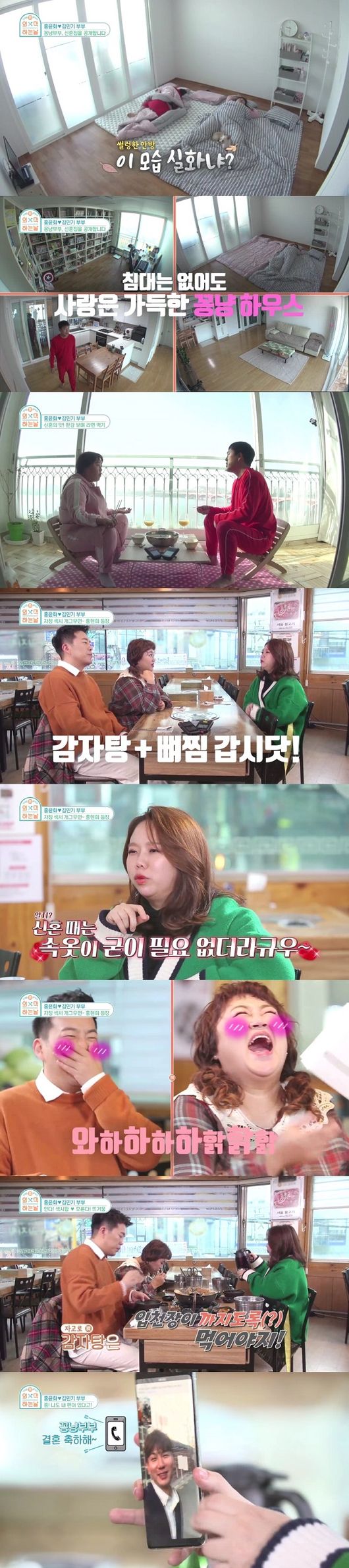 드디어 감자탕이 등장했고, 세 사람은 본격 먹방에 돌입했다. 홍현희는 손으로 우거지를 들고 섹시한 포즈로 먹어 치명적인 매력을 자랑해 홍윤화-김민기 부부를 웃게 했다. 급기야 뜨거운 감자와 우거지를 함께 먹고 표정으로 뜨거움을 표현해 또 한번 폭소탄을 날렸다.
