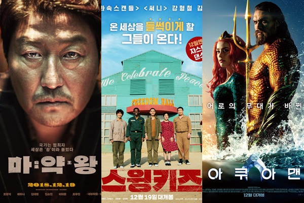 '마약왕', '스윙키즈', '아쿠아맨' 이 19일 동시에 개봉했다. 연말 기대작들이 한꺼번에 쏟아지면서 박스오피스 순위도 요동칠 것으로 보인다.