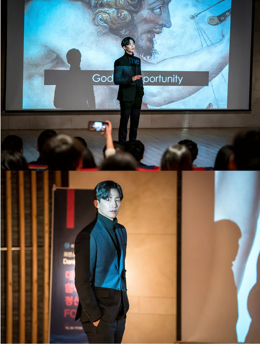 사진 속 송재림은 블랙 수트를 입고 신경정신과의사 다니엘 최로 완벽 변신해 강의를 하고 있다. 남성미를 한껏 부각시키는 그의 넓은 어깨와 날렵한 턱선, 또렷한 이목구비는 여심을 설레게 한다.