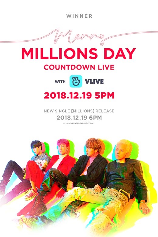 위너는 이날 오후 6시 각종 음원사이트를 통해 새 싱글 ‘밀리언즈(MILLIONS)’를 발표한다. 지난 4월 '에브리데이(EVERYDAY)' 이후 약 8개월만의 컴백이다.