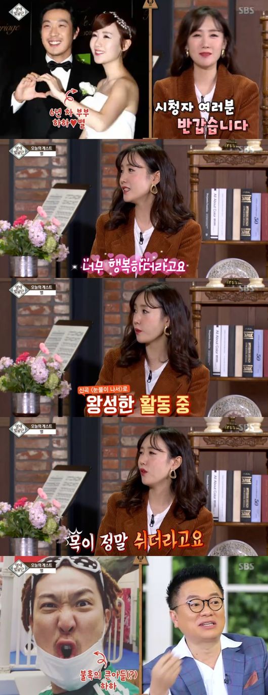 MC들은 별이 목이 자주 쉬냐고 묻자, 별은 "노래로 해서 목이 안 쉬는데, 아들 둘 키우니까 목이 쉰다"고 말했다. 그러면서 MC들은 "남편행세하는 아들이 있다더라"고 하자 별은 "집에 마흔살 된 큰 아들이 있다"면서