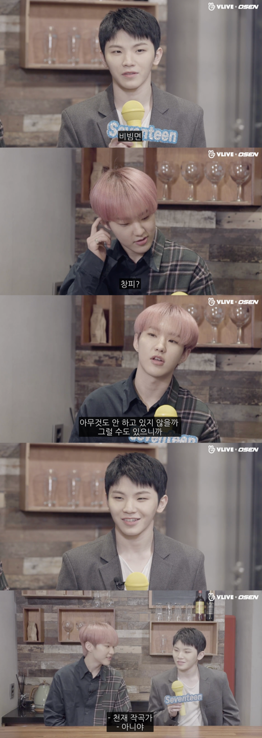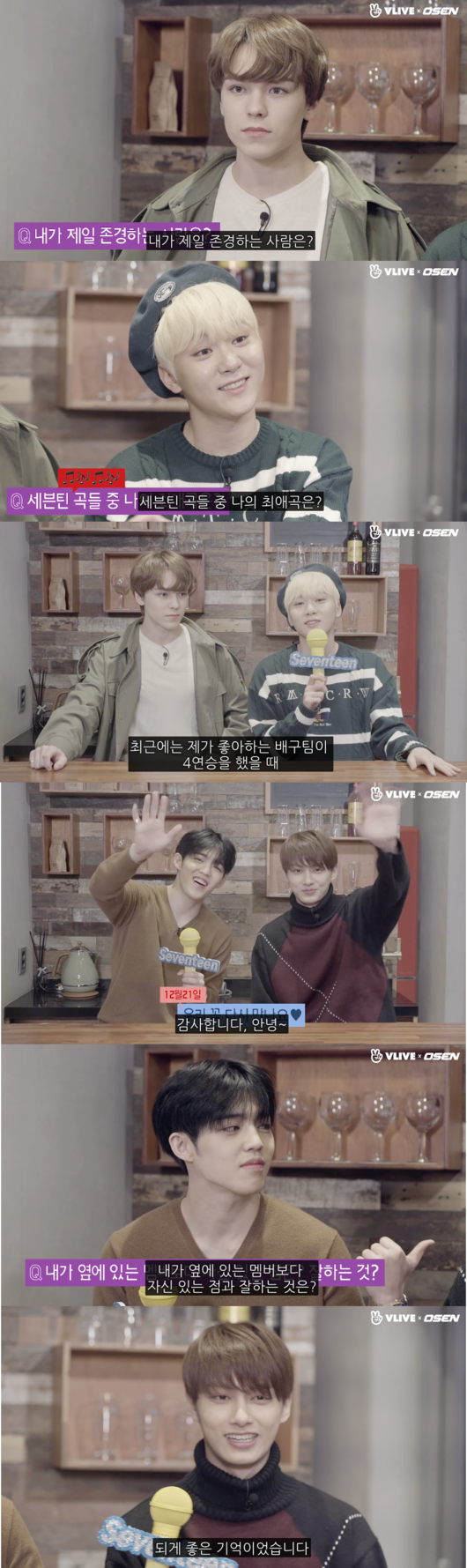 19일 오후 9시 포털사이트 네이버 V라이브 OSEN 채널에서는 세븐틴의 멤버 버논과 승관, 호시와 우지, 에스쿱스와 준의 인터뷰가 진행됐다.