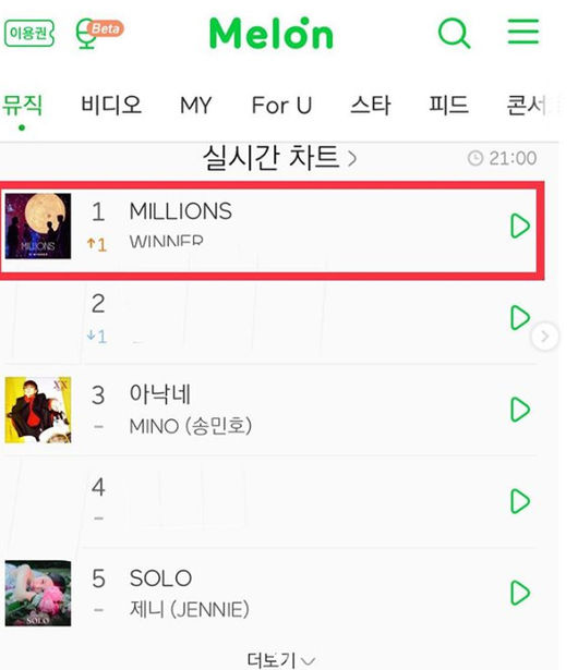 위너의 '밀리언즈'는 20일 오전 멜론, 지니, 올레뮤직, 소리바다, 벅스뮤직 등에서 음원차트 1위를 기록하고 있다. 지난 19일 오후 6시 발매된 직후 1위에 오르더니 굳건히 지키고 있는 정상이다.