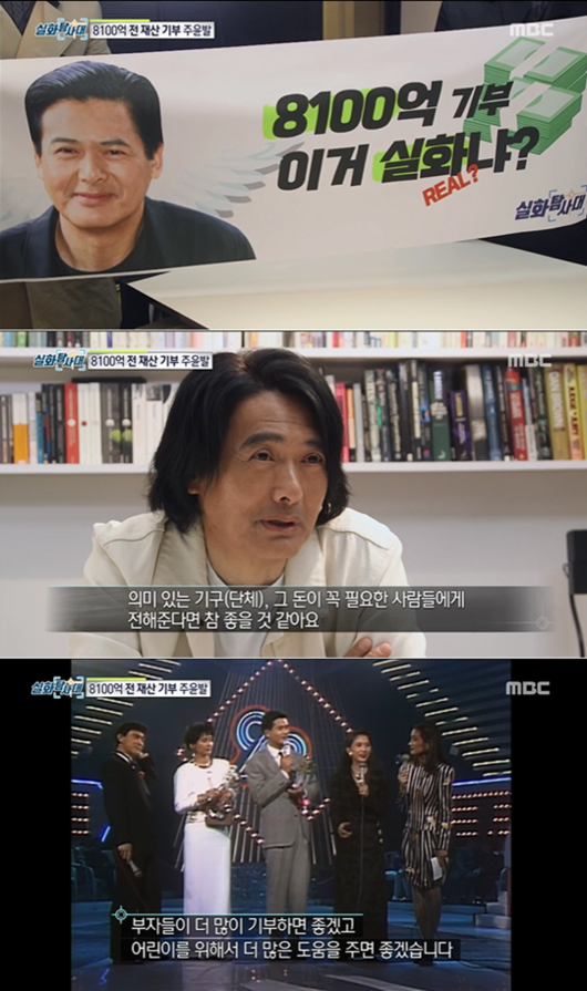 세상을 놀라게 한 기부에 대해서는 “아내도 찬성”했다고 고개를 끄덕인 후 “돈은 영원히 가질 수 없다. 세상을 떠나면 여전히 다른 누군가가 쓰게 남길 수밖에 없는 것”이라고 밝혔다. ‘실화탐사대’는 주윤발이 1989년 한국을 방문했을 때 ‘토요일 토요일은 즐거워’에 출연해 자선 활동에 대한 계획을 밝히는 장면을 찾아내, 그의 선행이 갑작스러운 것이 아님을 증명했다.