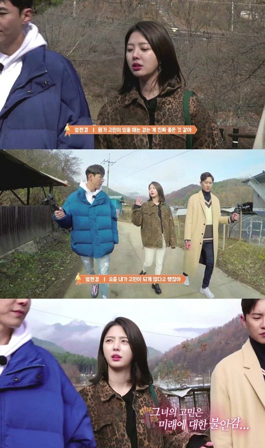 엄현경은 송재희, 이태경에게 "뭔가 고민이 있을 때는 걷는 게 진짜 좋은 것 같다"라며 "요즘 내가 고민이 되게 많다고 했었는데 그게 미래가 너무 불안하다는 거다. 우리 같은 일은 계속 일이 있는게 아니잖냐"라고 걱정거리를 꺼냈다.