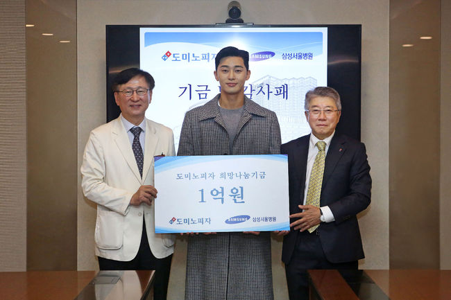 전달식에는 오광현 한국 도미노피자 회장, 권오정 삼성서울병원 원장, 한국 도미노피자 전속 모델 박서준이 함께했다.