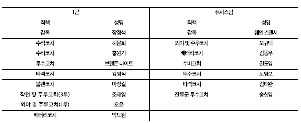 또한 2군 매니저 역할을 했던 권도영 대리가 퓨처스팀 수비 코치로 이동했고, 전력분석 업무를 담당했던 노병오 전력분석원이 퓨처스팀 투수치로 선임돼 선수들 지도에 나선다.