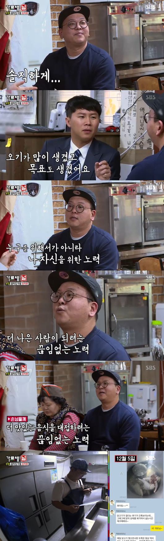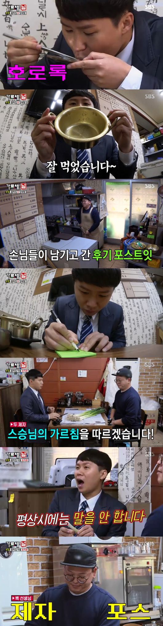 양세형도 응원의 글을 남겼다. 양세형은 재료손질을 도와주기로 했다. 홍탁집 子는 "재료 앞에 두고 말 하지말라고 하셨다"면서 침이 튀지 않기위해 고개를 돌리고 재료손질을 했다. 게다가 레시피를 알려줬지만, 계속해서 스스로 공부하고 연구한다고. 끊임없이 발전하려고 노력 중이라고 했다. 끊임없이 육수공부도 계속하고 있어, 백선생도 모르는 새로운 재료가 추가됐다고해 놀라움을 안겼다.