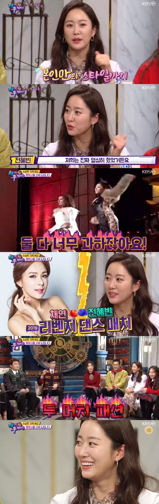 전혜빈은 흑역사에 대해 한 시상식에서 채연과 함께 선 무대를 언급했다. 자료 화면 속 전혜빈과 채연은 투 머치 패션과 과감한 제스처 등 파격적인 모습으로 웃음을 더했다.