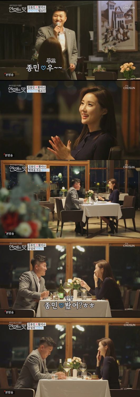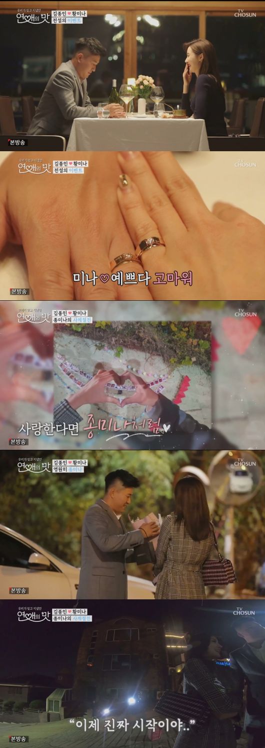 20일 방송된 TV조선 예능 ‘연애의 맛’에서 김종민과 황미나가 공개 열애를 선언하며 앞으로 출연하지 않을 것임을 넌지시 암시했다. 두 사람을 지켜보던 최화정도 “이젠 저 두 사람을 어떻게 할 수 없다”고 말하면서 썸 타던 두 사람의 본격 연애를 알렸다.
