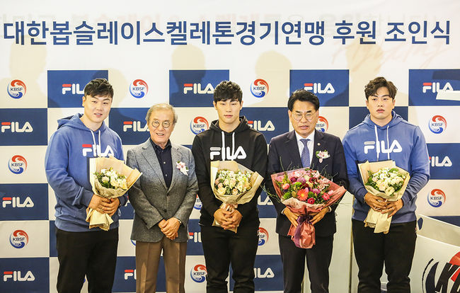 대한봅슬레이스켈레톤경기연맹은 21일 오전 경기 부천시 현대백화점 중동점 U-PLEX 1층서 휠라코리아와 후원 협약식을 가졌다. 대표팀은 내년 1월 월드컵 3차대회부터 휠라 경기복을 입고 나선다. 2022년까지 훈련복을 비롯한 각종 의류, 용품 일체를 지원받는다. 이날 행사엔 윤윤수 휠라코리아 회장을 비롯해 윤성빈(스켈레톤), 원윤종, 서영우(이상 봅슬레이), 이용 총감독 등이 참석했다.