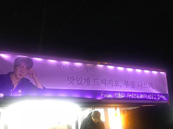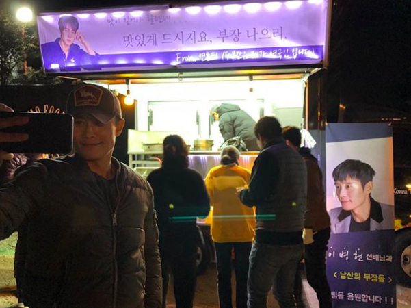 공개된 사진 속 이병헌은 유연석이 촬영 현장에 보내준 커피차 앞에서 미소를 짓고 있다. 유연석은 이병헌과 함께 출연했돈 tvN '미스터 션샤인' 속 대사를 활용, "맛이 깊어야 할텐데. 맛있게 드시지요, 부장 나으리"라는 센스넘치는 문구를 적었다.
