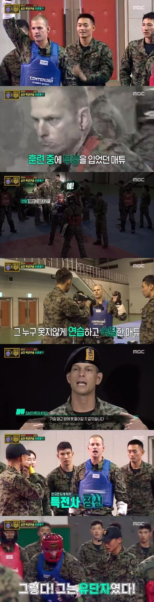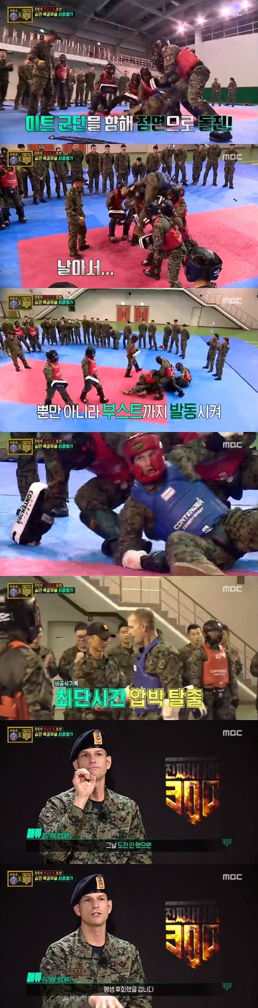 실전 특공무술 훈련에서는 10인이 상체에 보호 장비를 착용한 채 진지한 얼굴로 훈련에 참여했다. 칼과 총을 든 무기를 가진 상대를 제압해야 하는 고난도 훈련이었다.