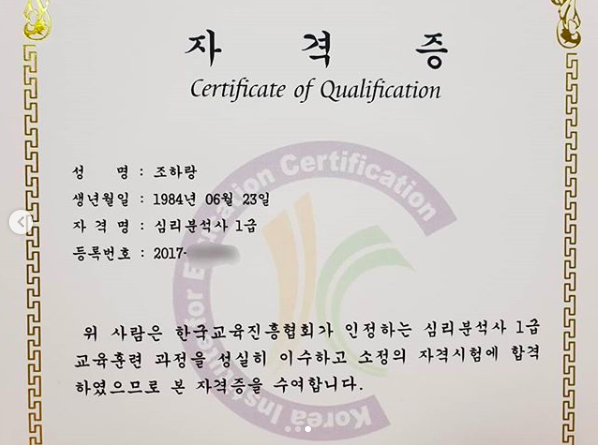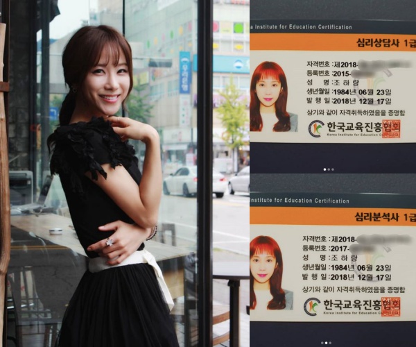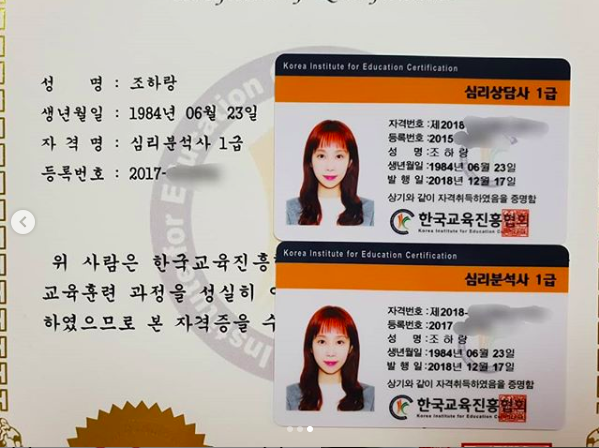 걸그룹 쥬얼리 출신 조민아가 타로 심리 상담사 자격증에 이어 심리상담사, 심리분석사 1급 자격증을 취득했다.