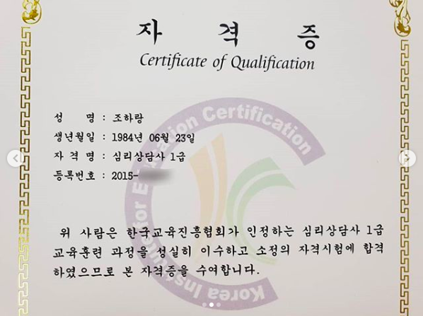 이어 “노인 복지분야도 공부중이니 꾸준하게 보다 깊고 넓어져갈게요. 살고 싶었던 그림대로 계획을 세워 실천해가며 이루어내는 삶이 값지고 행복합니다”라고 자격증을 찍은 사진을 올렸다.