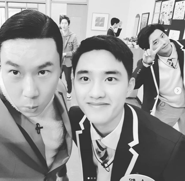 이상민은 21일 자신의 인스타그램에 "경수(디오 본명)랑 찬열이랑 저기 뒤에 세훈이랑. 영화 '스윙키즈' 얘기하다가 한 컷"이라는 글과 함께 여러 장의 사진을 게재하고 있다.