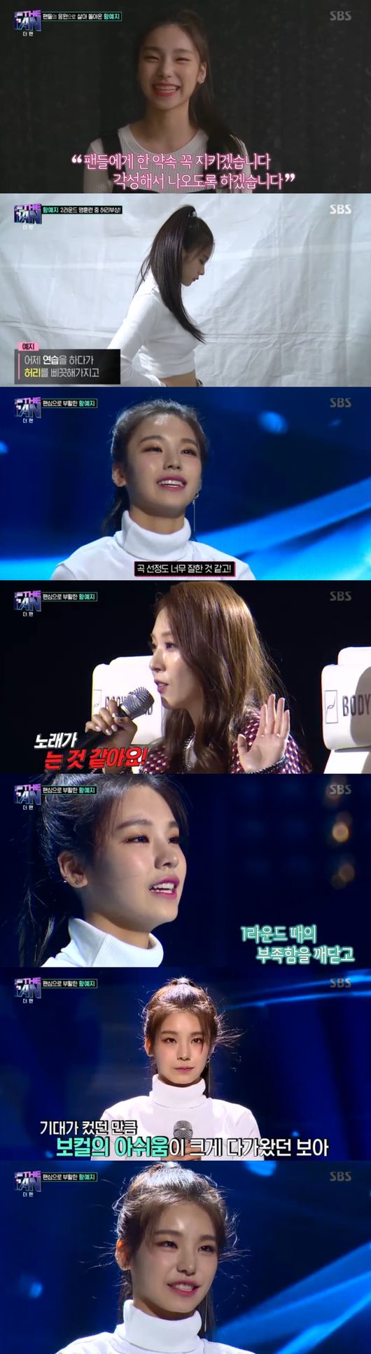 다음은 팬들의 응원으로 살아돌아온 황예지가 무대위로 올랐다. 그녀는 "응원해주신 분들 생각하며 열심히 연습, 이를 갈았다"면서 "연습하다 허리를 다쳤지만 열심히 할 것"이라며 조금 긴장된 모습을 보였다.