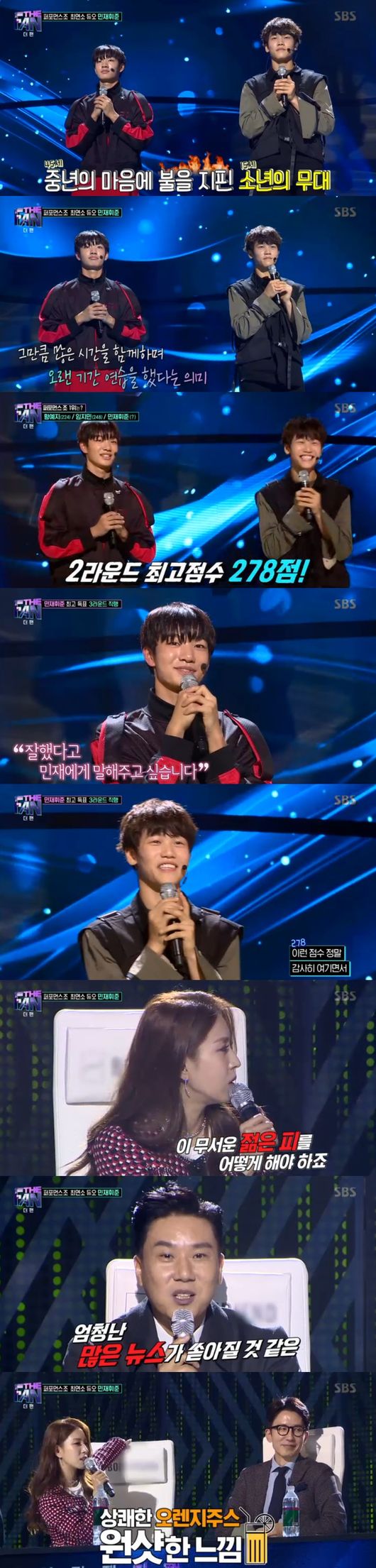 22일 방송된 SBS 예능 '더 팬'에서 최고득점을 달성한 15세 최연소 듀오, 송민재와 노휘준군의 모습이 그려졌다.