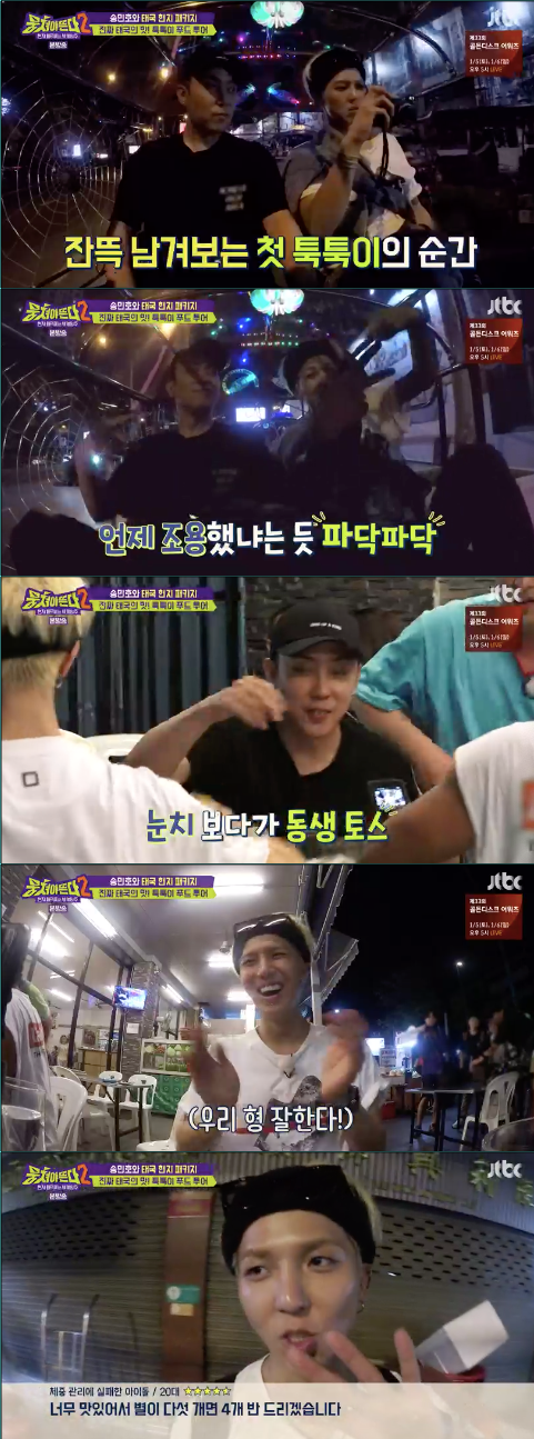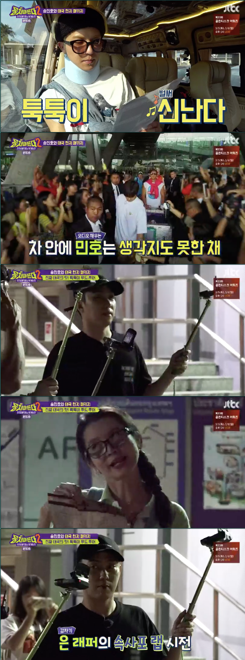 이후 본격적인 여행을 시작한 멤버들은 태국의 교통수단 중 하나인 툭툭이를 탔고, 그중에서도 아이돌 선후배이자 같은 소속사 식구인 은지원과 송민호는 이동하는 내내 힙합 스웨그를 뽐내 시선을 모았다. 정체를 알 수 없는 춤부터 표정까지, 그동안 볼 수 없었던 두 사람의 이색 매력이 드러난 순간이었다.