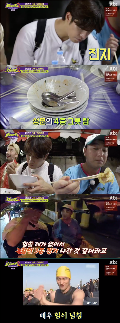 무엇보다 성훈은 태국 교통 수단 중 하나인 툭툭이를 타고선 그동안 보여주지 않았던 '어깨춤'으로 흥을 돋우는가 하면, 이날의 하이라이트였던 음식점에선 혼자서 조용히 태국 까르보나라 4그릇을 비워 모두를 놀라게 만들었다.