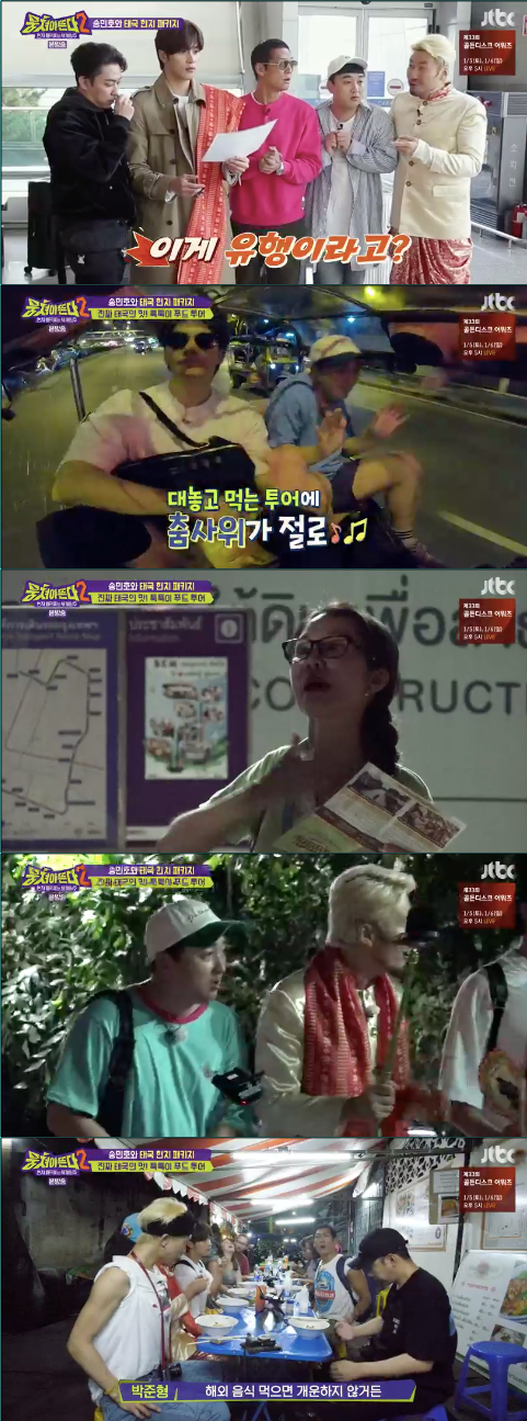 지난 22일 방송된 JTBC 예능 '뭉쳐야 뜬다 시즌2'에서는 게스트 위너 송민호와 함께 태국 방콕 여행을 시작하는 멤버들(god 박준형, 젝스키스 은지원, 노홍철, 황제성, 성훈)의 모습이 전파를 탔다.