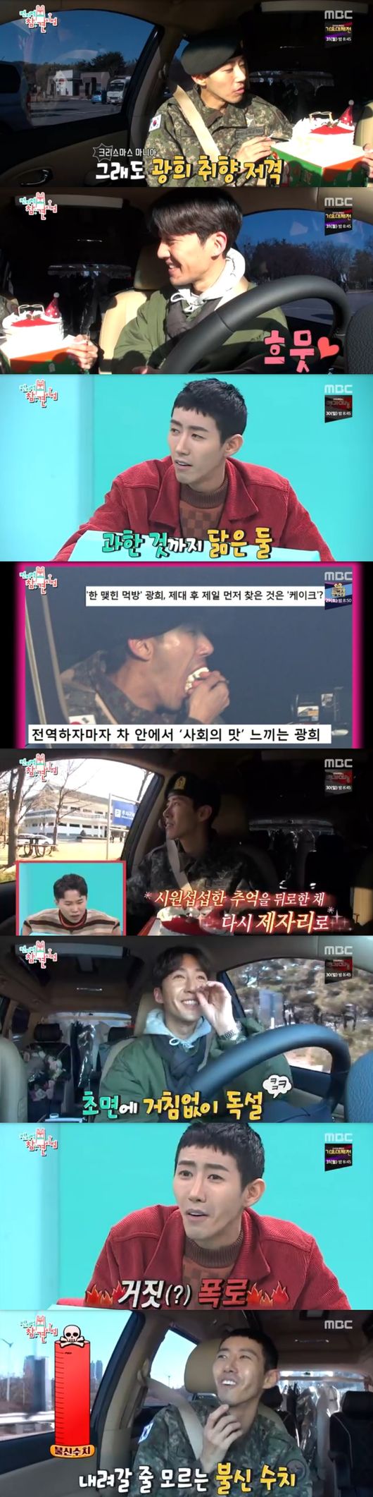 황광희와 말투가 비슷한 매니저는 "평소에도 광희형 닮았다는 얘기 많이 듣는다"고 했다. 외모도 어딘가 비슷한 두 사람이었다. 전역을 환영하는 플래시 소리가 터졌고, 매니저가 일회용카메라로 이를 찍었다. 인화된 사진을 선물해주고 싶었다고. 인터뷰하는 광희를 챙겼다. 광희는 거리를 둔 것에 대해 "매니저한테 짐을 던졌다고 말할까봐 내 짐을 내가 챙겼다"고 해명했다. 매니저는 케이크까지 준비했다. 군대에서 못 먹는 음식에 광희는 감동했다.이어 차안에서 함께 초를 불었다. 그리곤 케이크를 나눠먹었다.