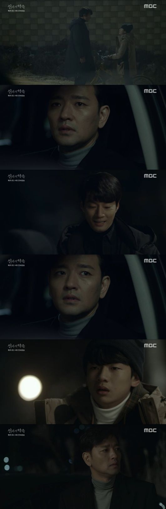 22일 방송된 MBC 토요드라마 '신과의 약속(연출 윤재문,극본 홍영희)'에서 현우(왕석현 분)가 재욱(배수빈 분)의 존재를 아는 모습을 민호(이천희 분)이 알아챘다.