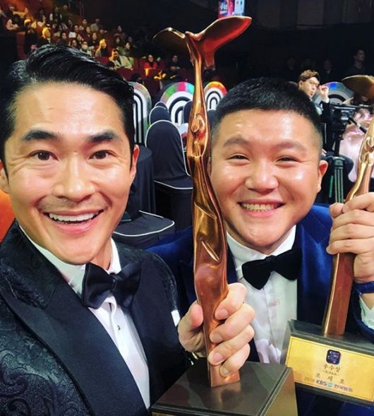 사진에는 KBS 예능 프로그램 ‘거기가 어딘데’로 함께 호흡을 맞췄던 방송인 조세호와 함께 활짝 웃고 있는 배정남의 모습이 담겨져 있다. 배정남과 조세호는 각각 KBS 핫이슈 예능인상과 우수상 트로피를 들고 카메라를 바라보고 있다.
