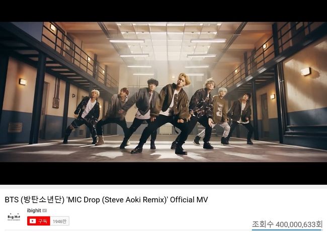 지난해 11월 공개한 ‘MIC Drop’ 리믹스 뮤직비디오는 23일 오전 11시 9분경 유튜브 조회수 4억건을 넘었다.