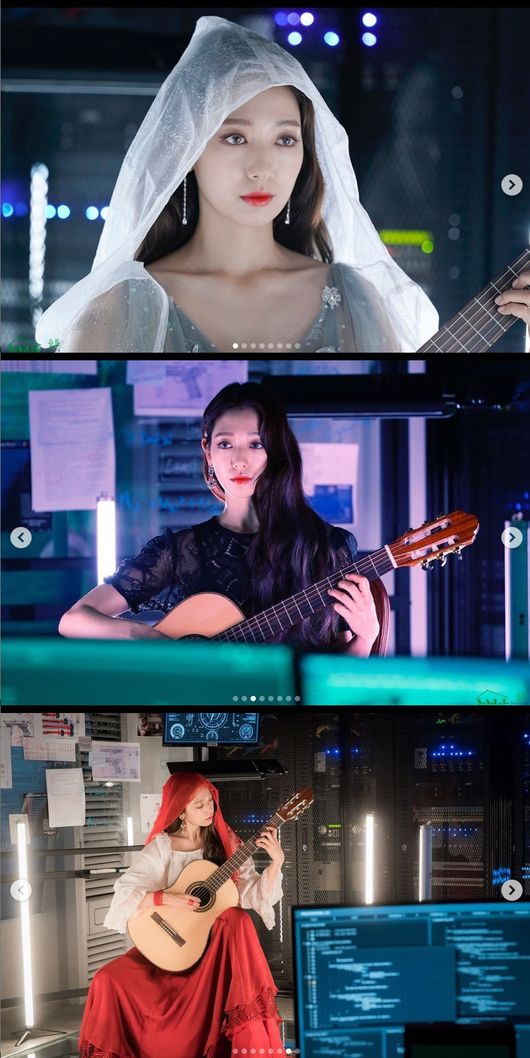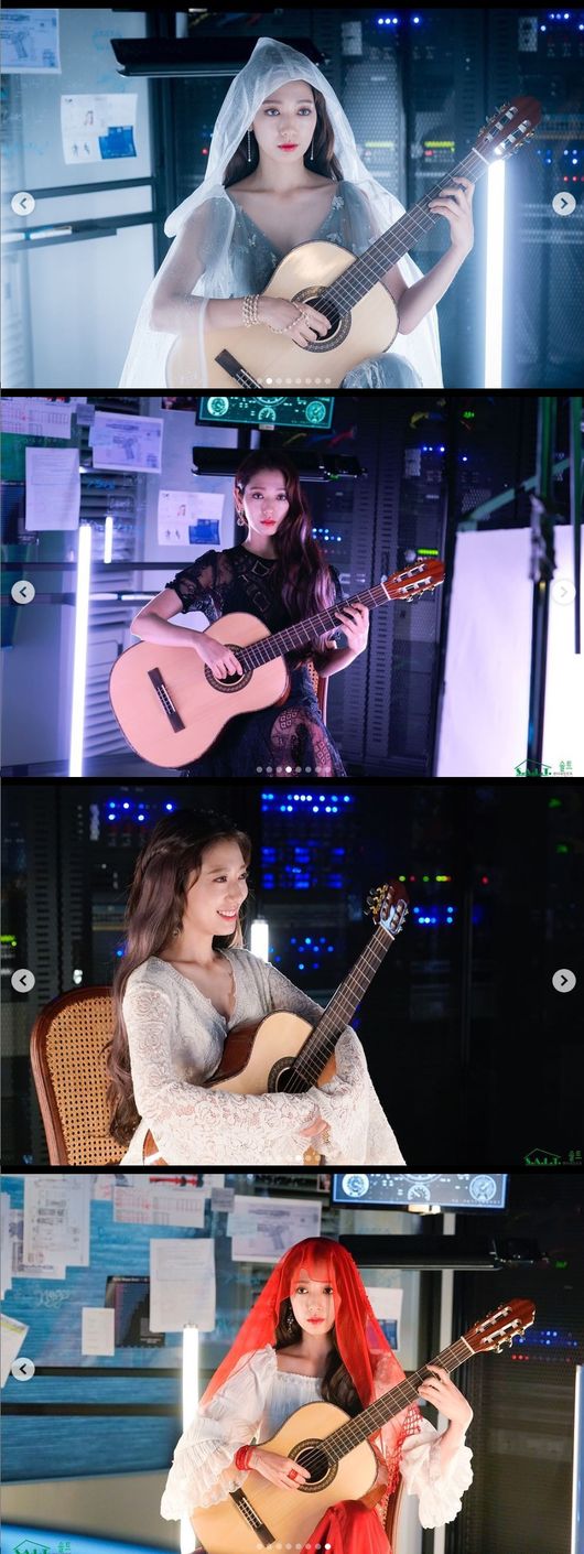 사진에서 박신혜는 흰 천, 붉은 천을 머리에 쓰고 트레이드마크인 기타를 연주하고 있다. 게임 속 여신 캐릭터가 그대로 튀어나온 듯한 몽환적이면서 신비롭고 아름다운 비주얼이 보는 이들을 시선을 강탈한다.