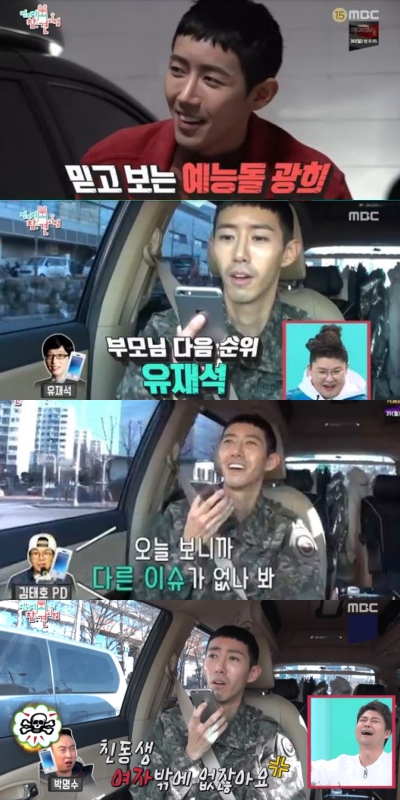 박명수와의 통화는 폭소에 정점을 찍었다. 황광희는 한 번도 자신의 면회를 오지 않은 박명수에게 서운해 했고, 박명수는 "내 친동생도 한 번도 안 갔다"고 응수했다. 이에 황광희는 지지 않고 곧바로 "친동생 여자밖에 없잖아요"라고 폭로해 큰 웃음을 선사했다.