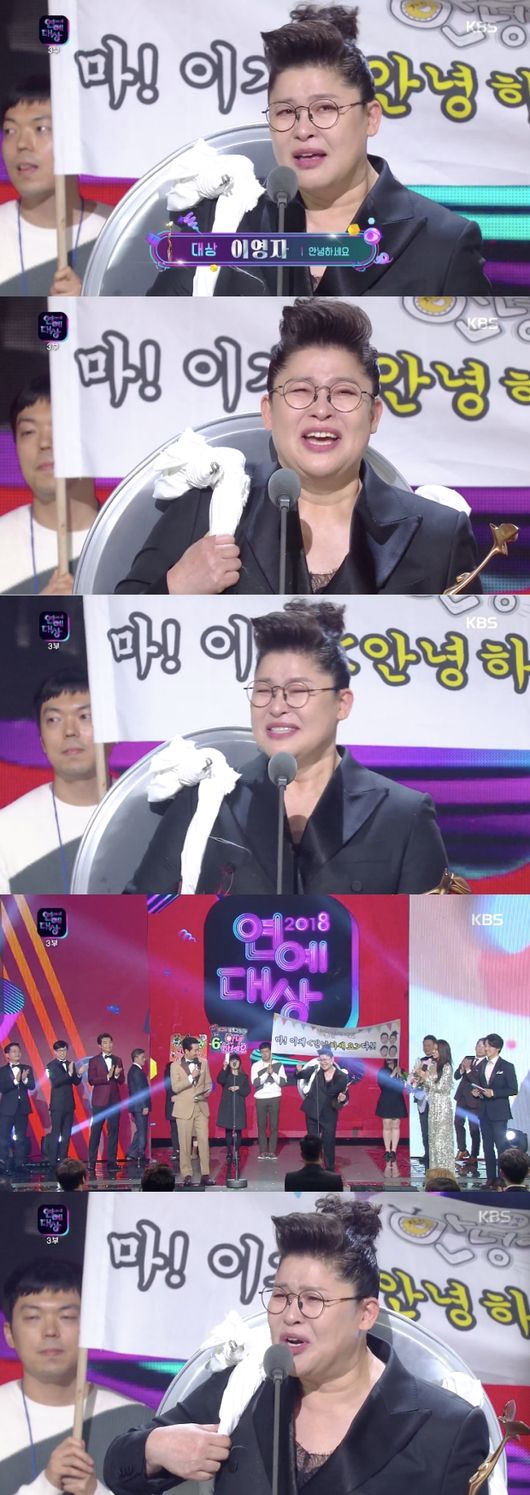 이영자는 개그계 선배들에게도 인사를 전했다. "전유성, 최양락 선배님에게 감사하다. 선배님들을 보면서 꿈을 꿨는데, 제가 그렇게 꿈을 꾸다보니, 이 자리에 서게 됐다. 제가 이렇게 상을 받을 줄 몰랐다”고 겸손하게 말했다.